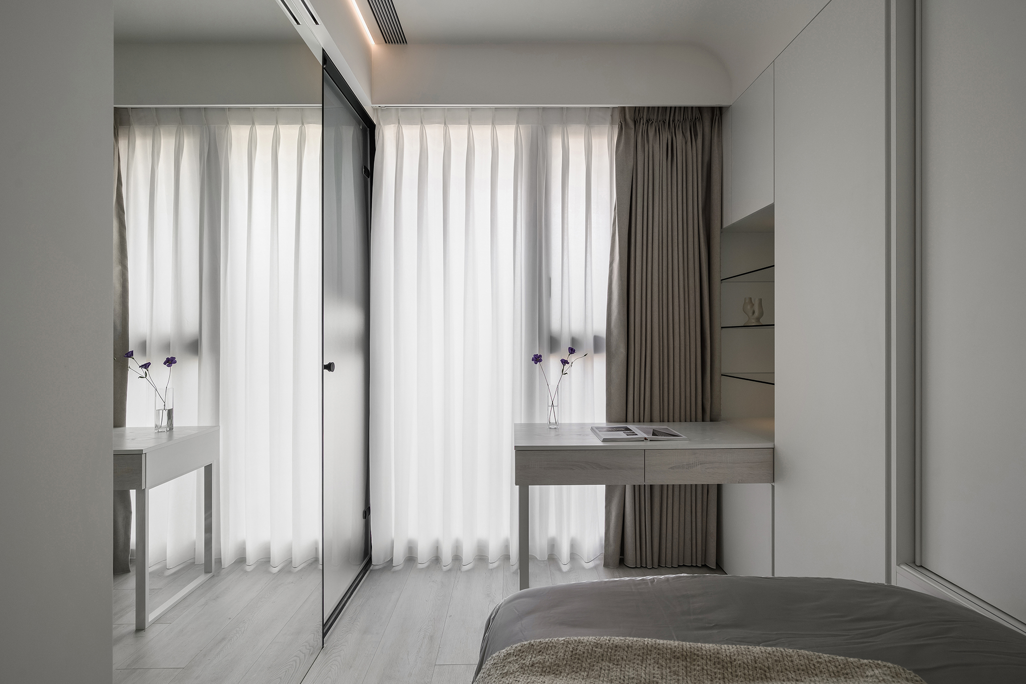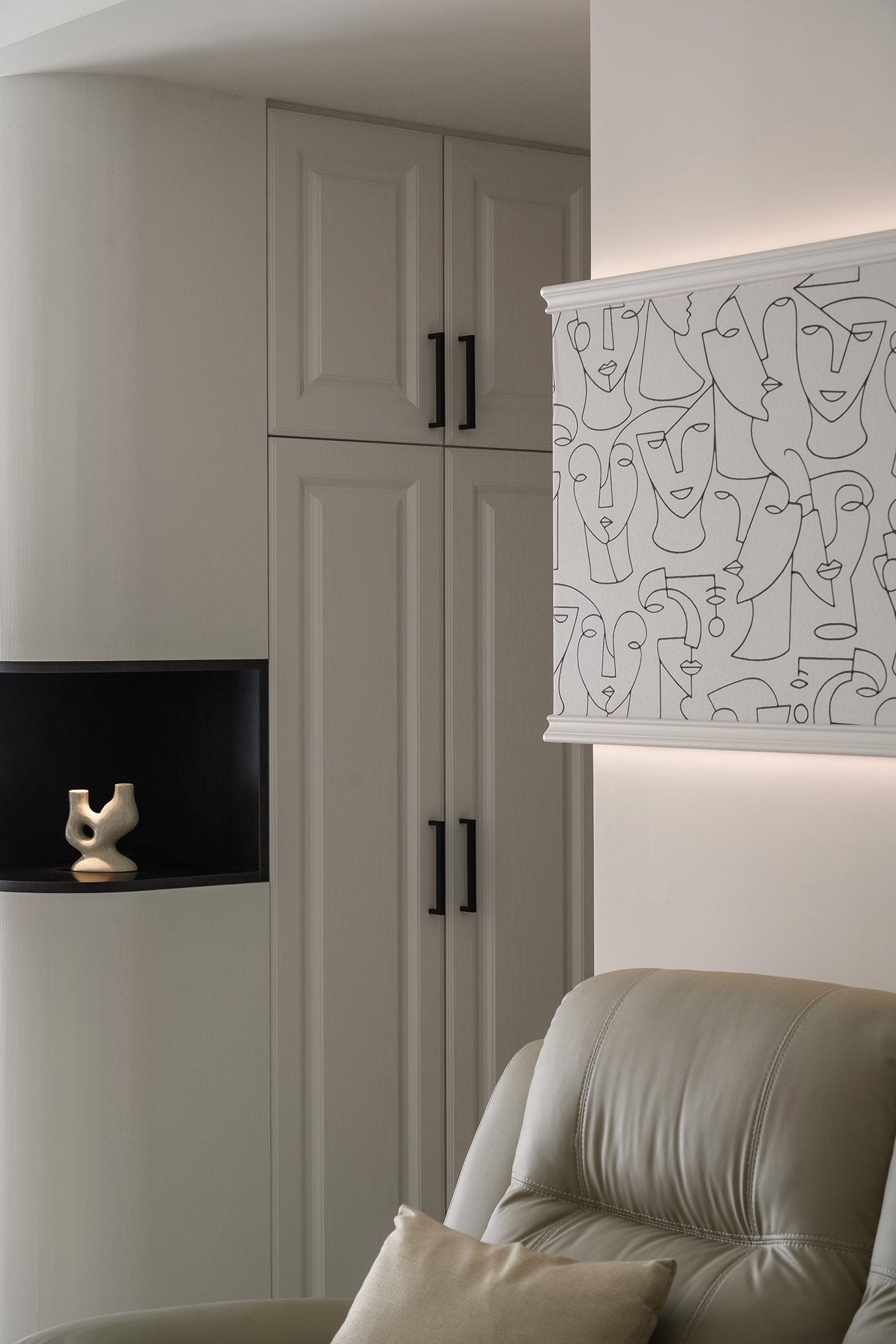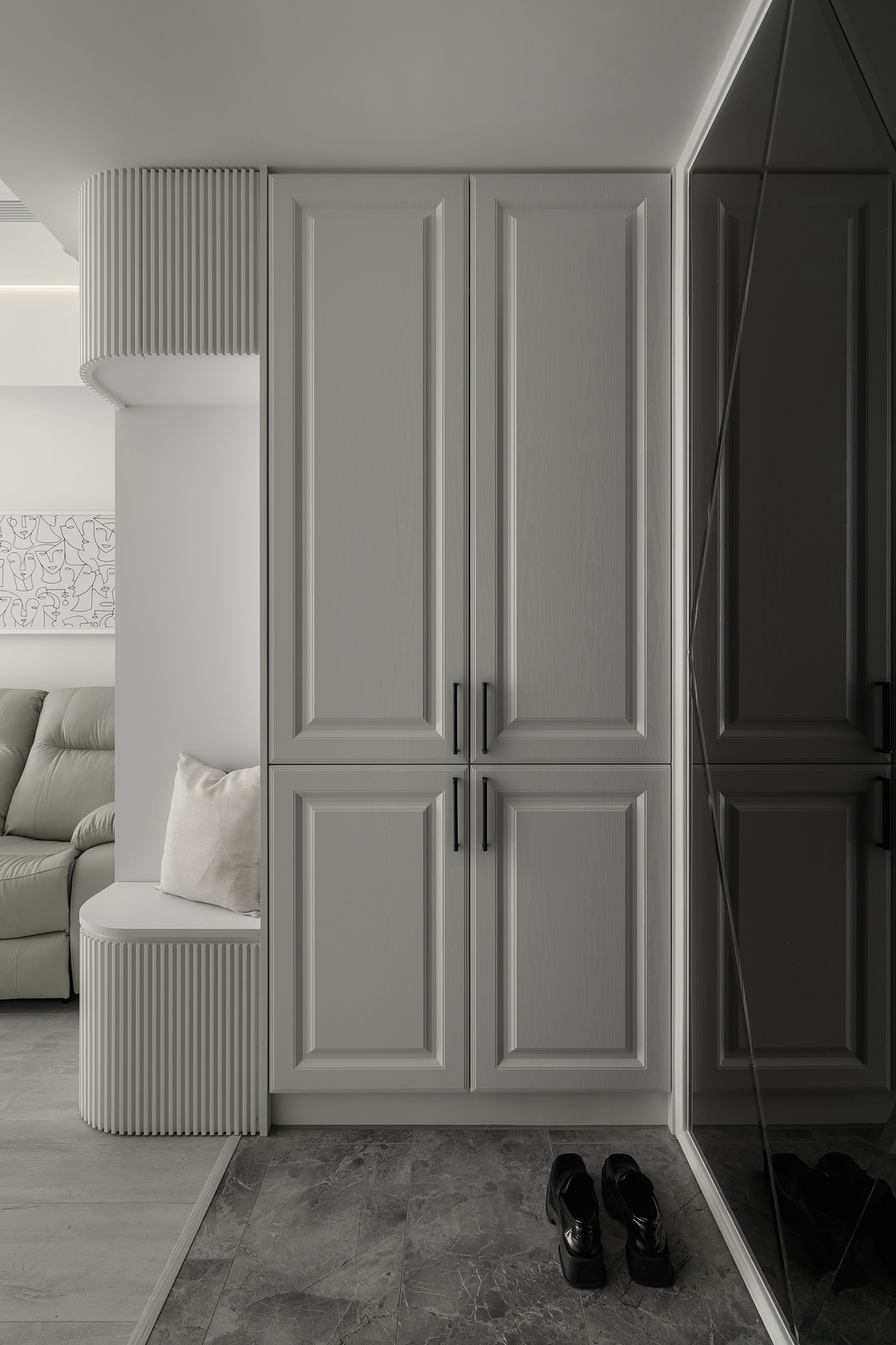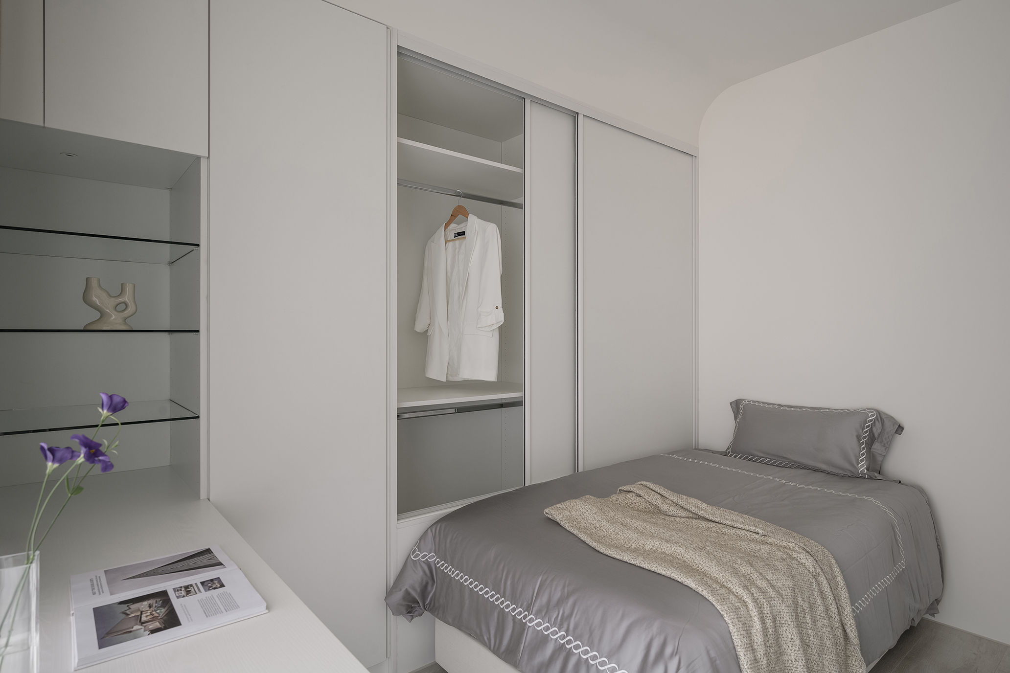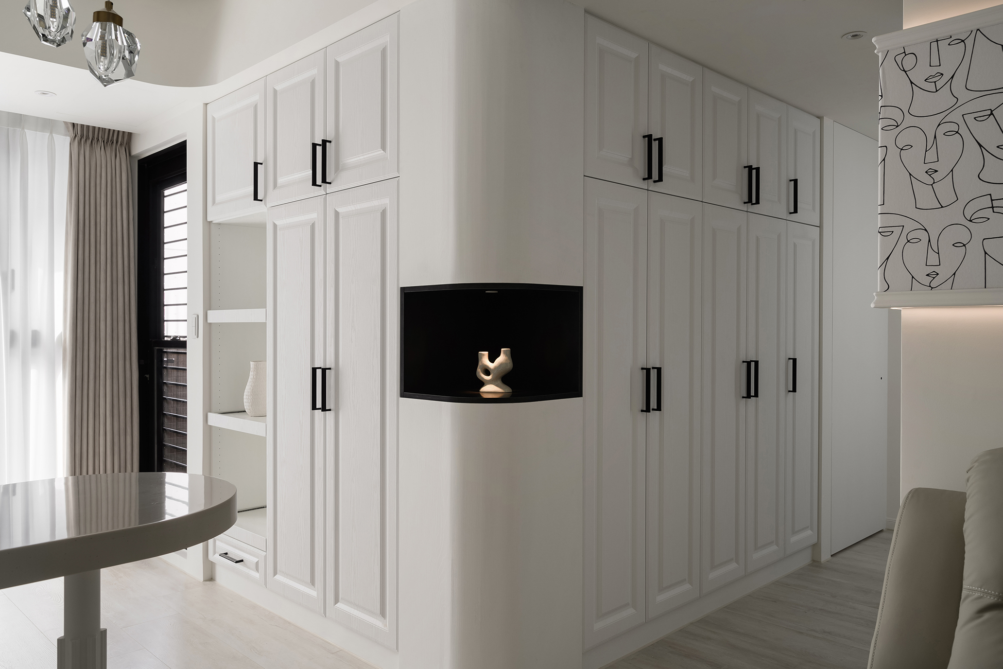 每一個設計如同一首優雅的詩篇,詮釋我們對完美美學的不懈追求。純白的背景猶如清晨的曙光,與木紋的自然紋理交織,譜寫出一曲純淨與精緻的交響樂。圓弧形的收納櫃線條柔和流暢,宛如流動的詩意,將空間轉化為一個藝術殿堂。