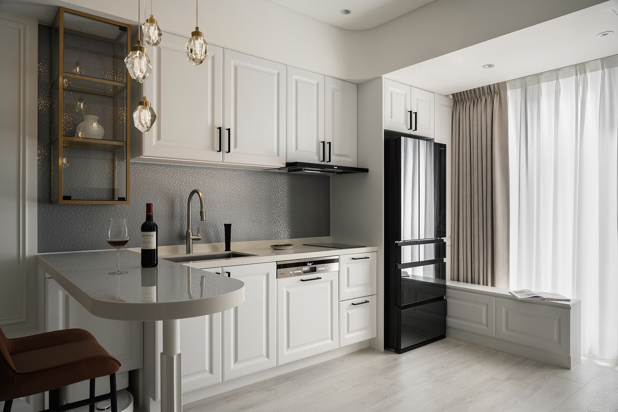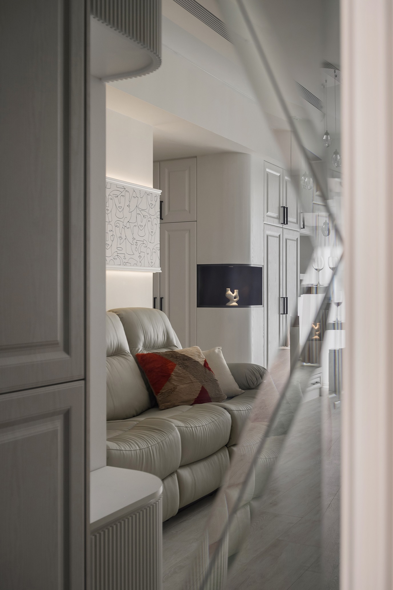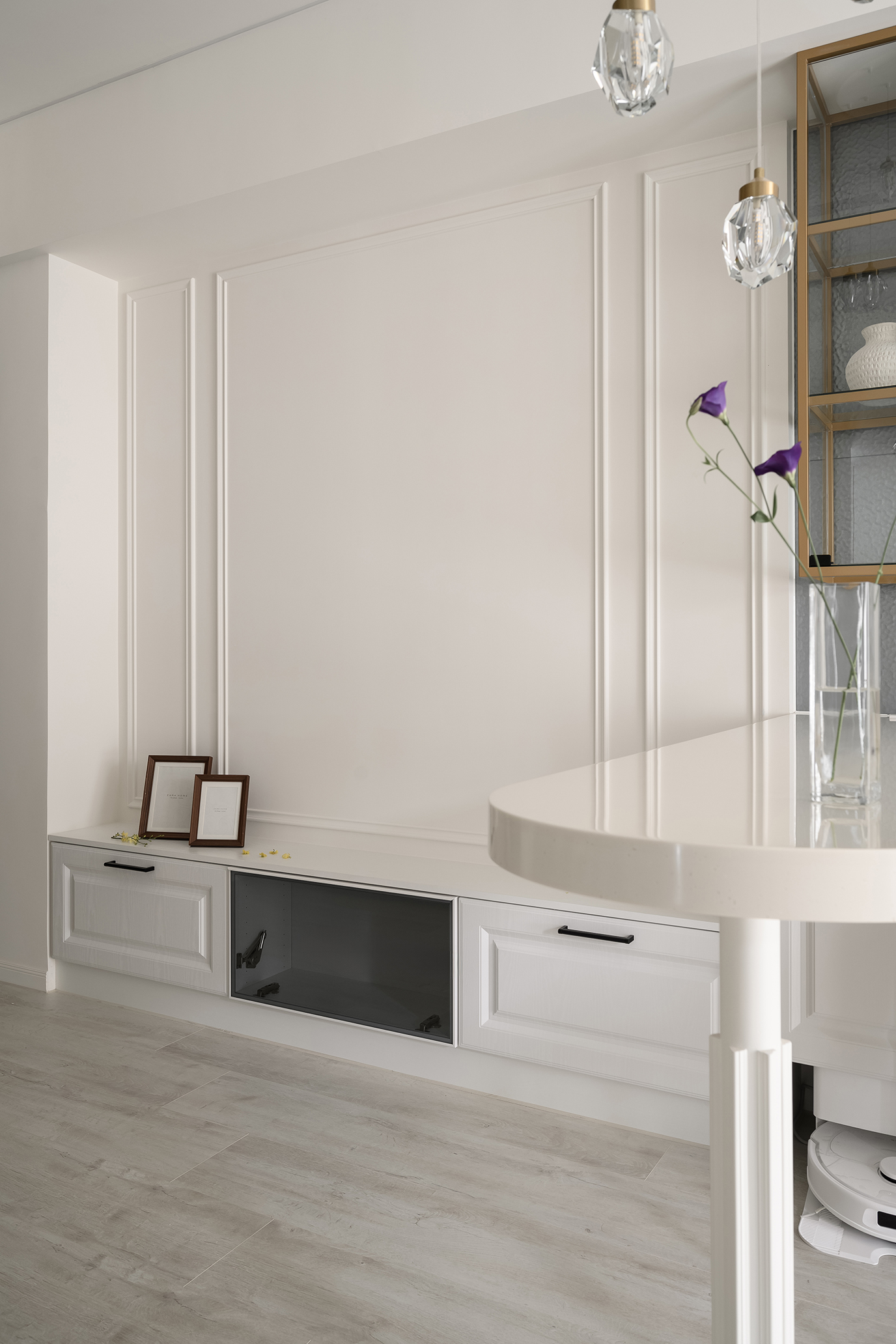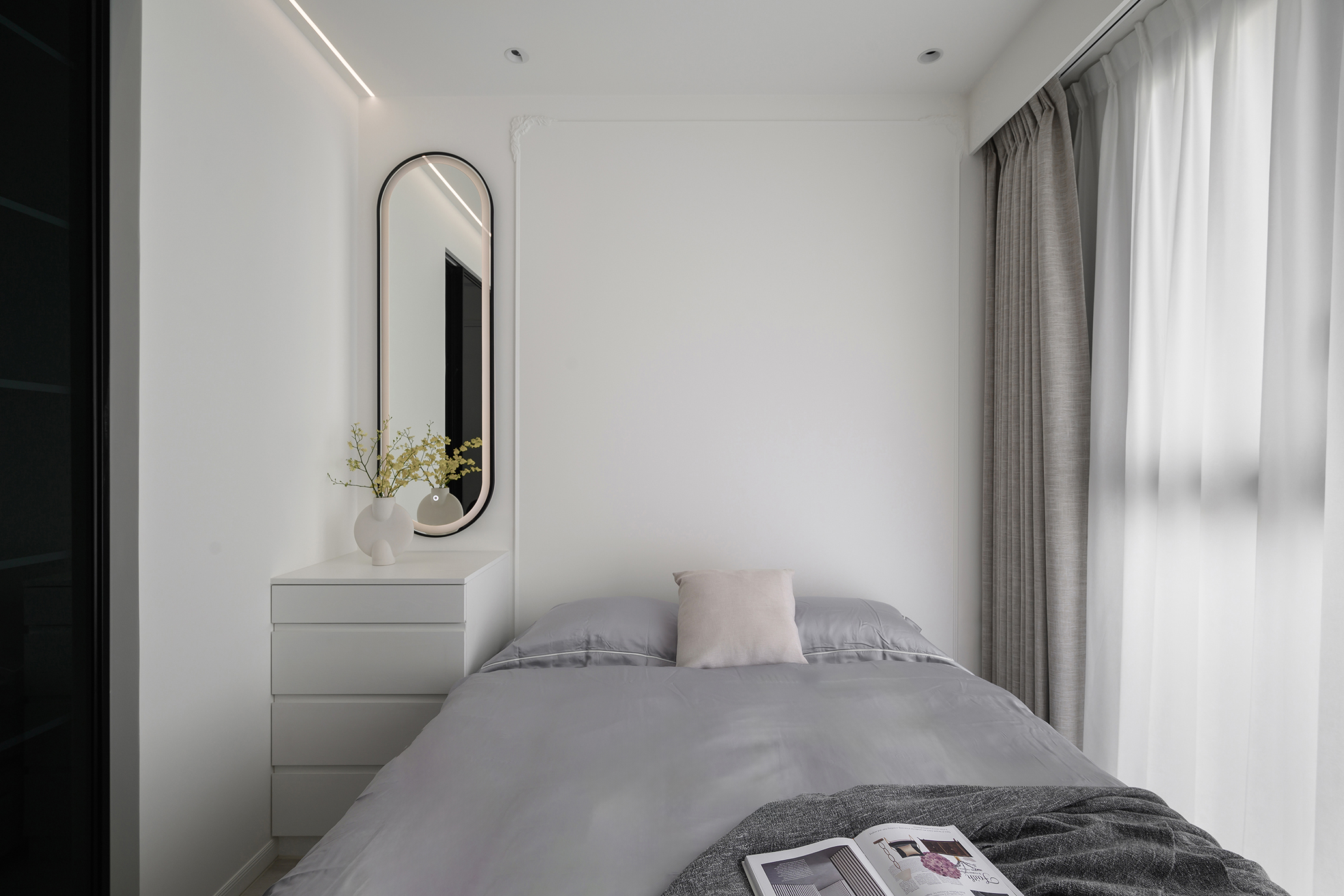 每一個設計如同一首優雅的詩篇,詮釋我們對完美美學的不懈追求。純白的背景猶如清晨的曙光,與木紋的自然紋理交織,譜寫出一曲純淨與精緻的交響樂。圓弧形的收納櫃線條柔和流暢,宛如流動的詩意,將空間轉化為一個藝術殿堂。