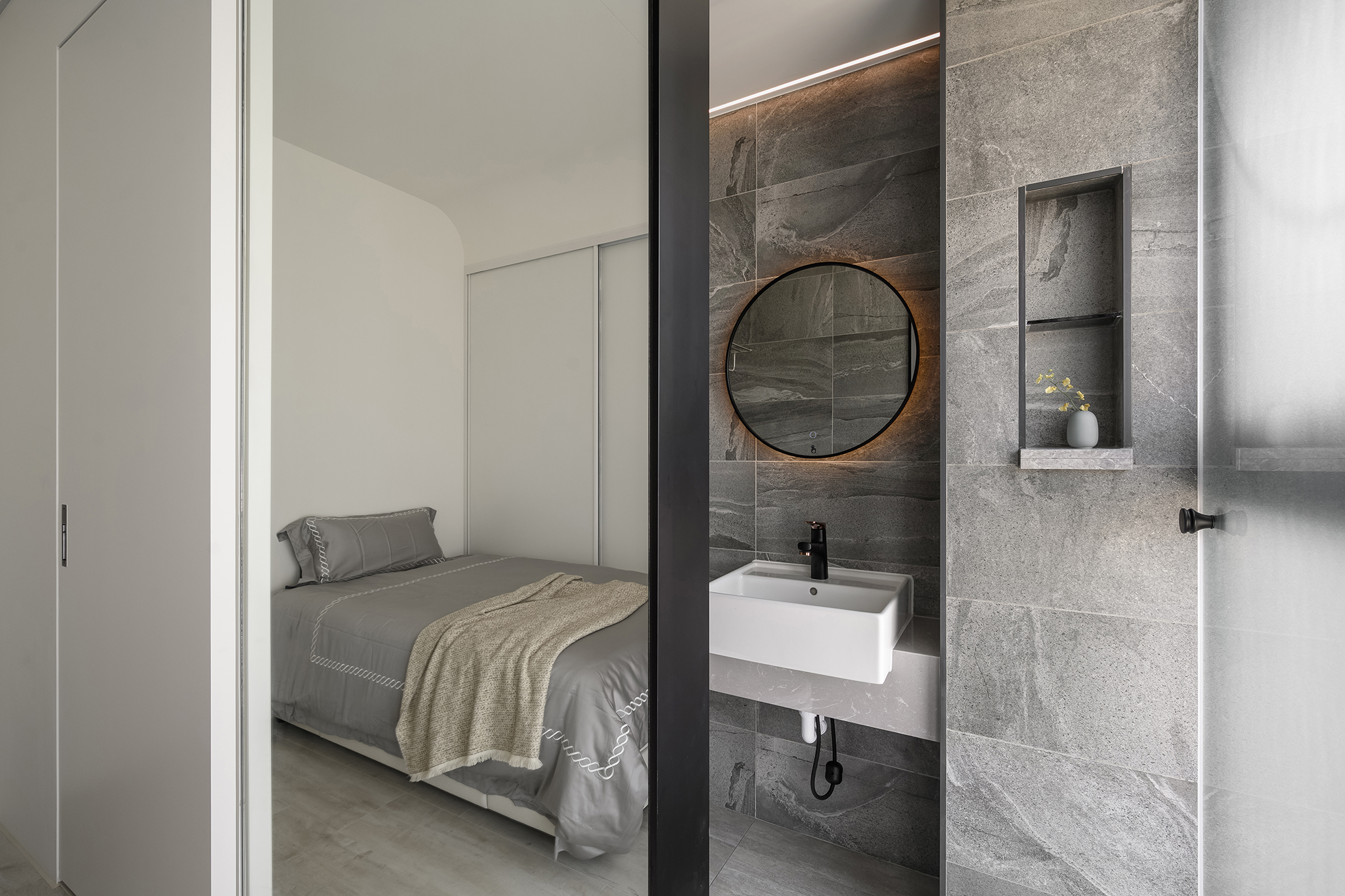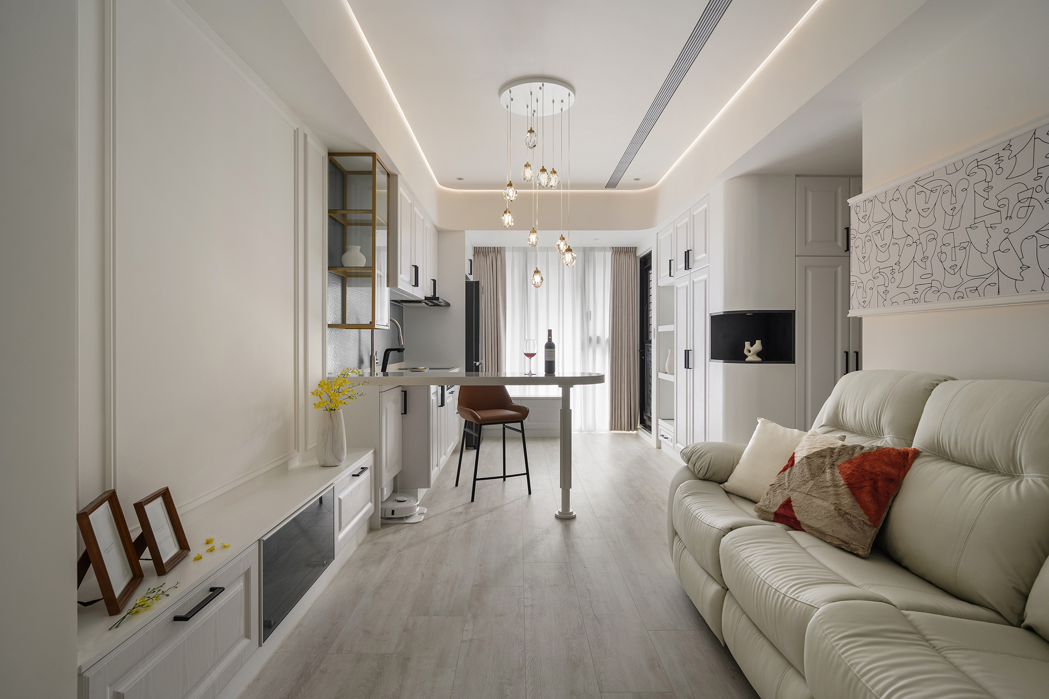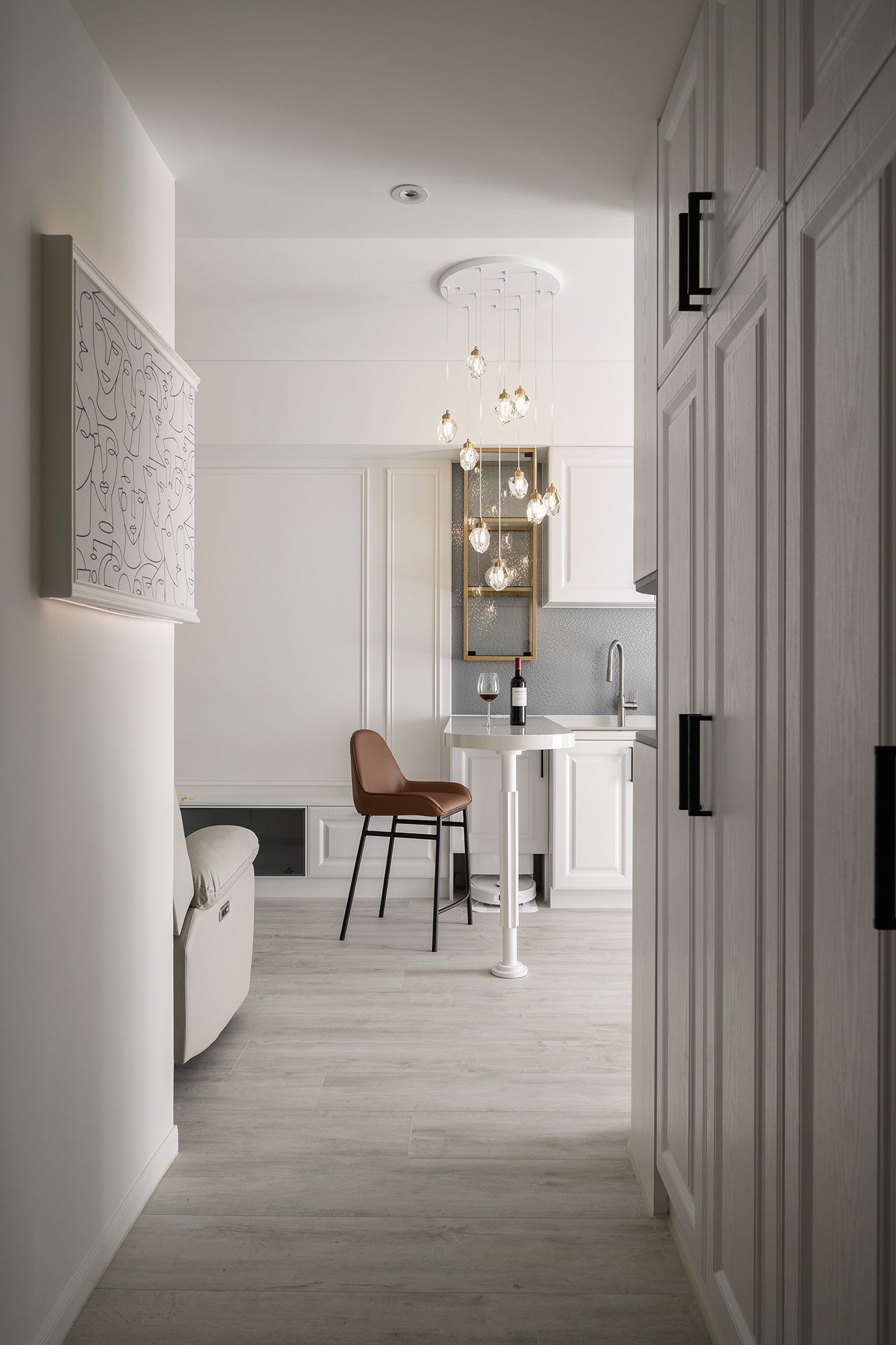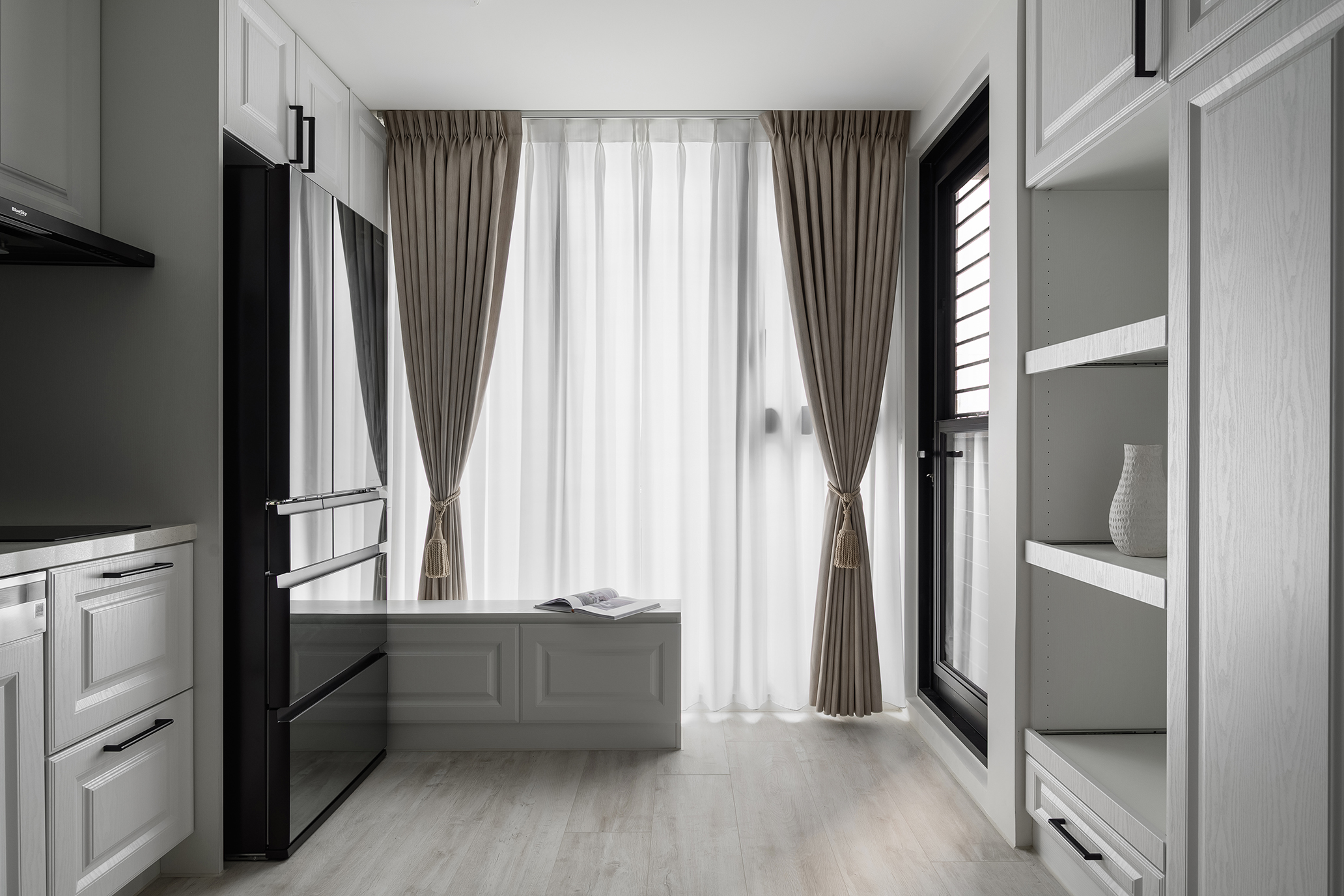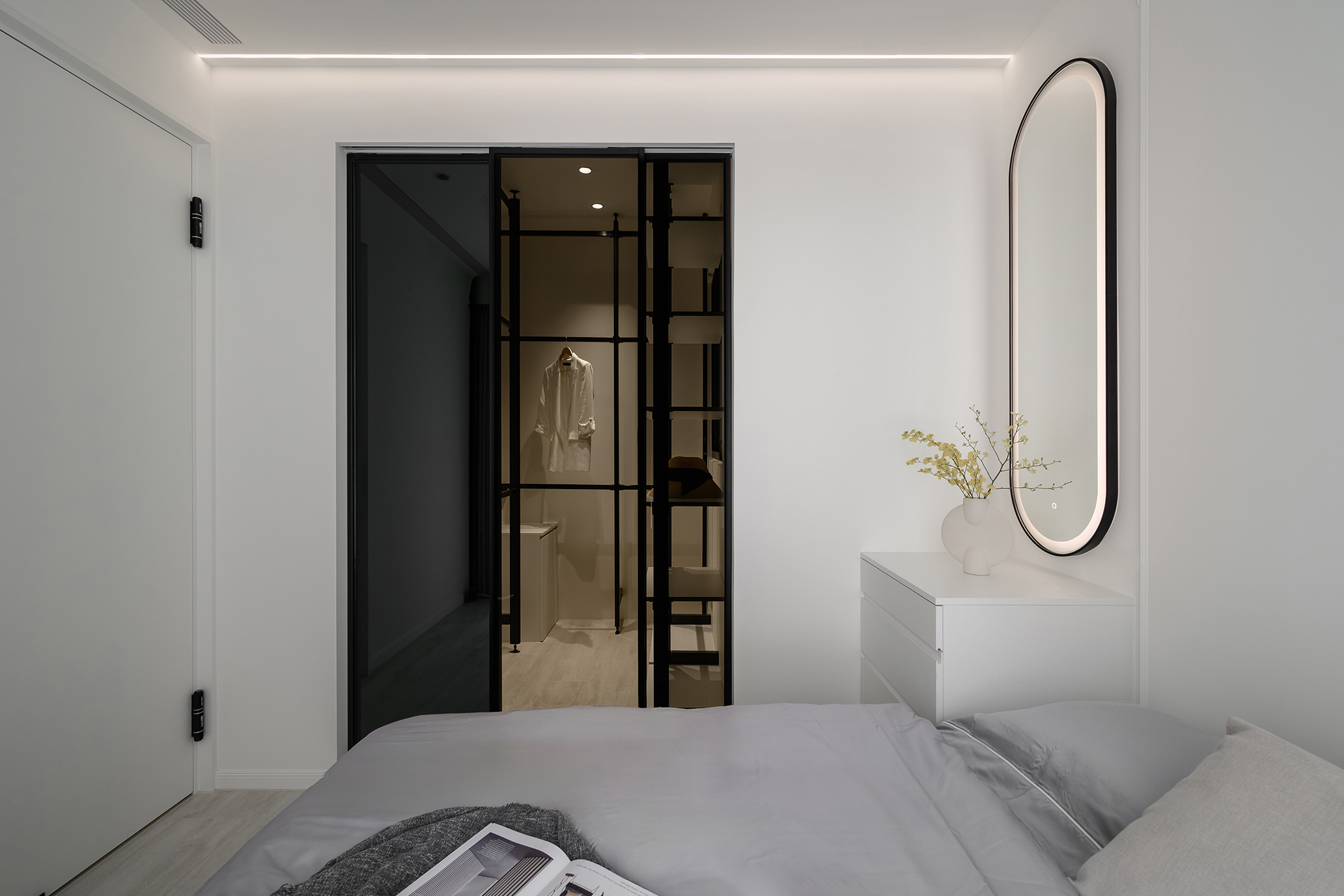 每一個設計如同一首優雅的詩篇,詮釋我們對完美美學的不懈追求。純白的背景猶如清晨的曙光,與木紋的自然紋理交織,譜寫出一曲純淨與精緻的交響樂。圓弧形的收納櫃線條柔和流暢,宛如流動的詩意,將空間轉化為一個藝術殿堂。