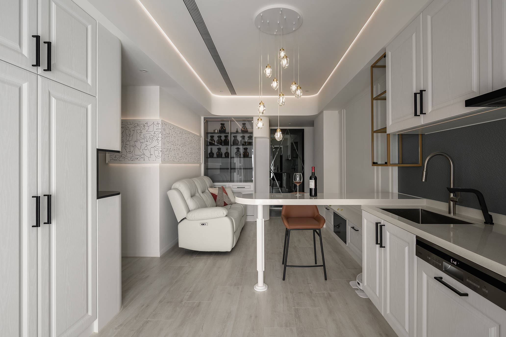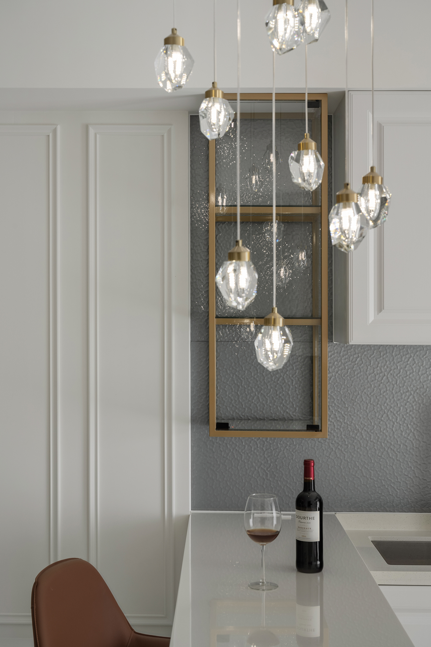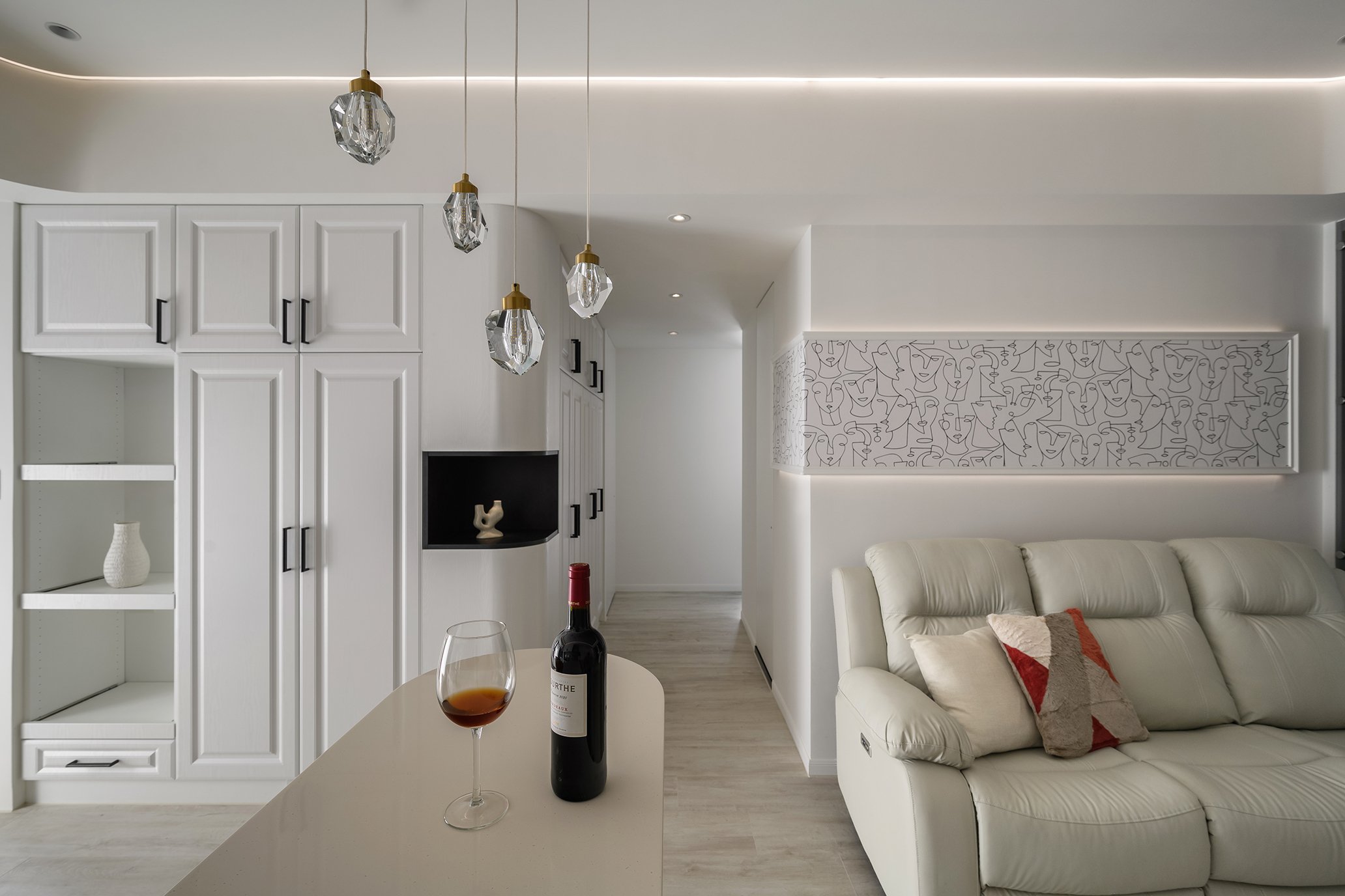 黑白線條壁畫宛如藝術家的手筆,點綴著每個角落,將其化為獨特的藝術作品。垂吊的水晶燈在光影間閃爍,彷如夜空中的繁星,為空間增添一絲奢華與深邃。