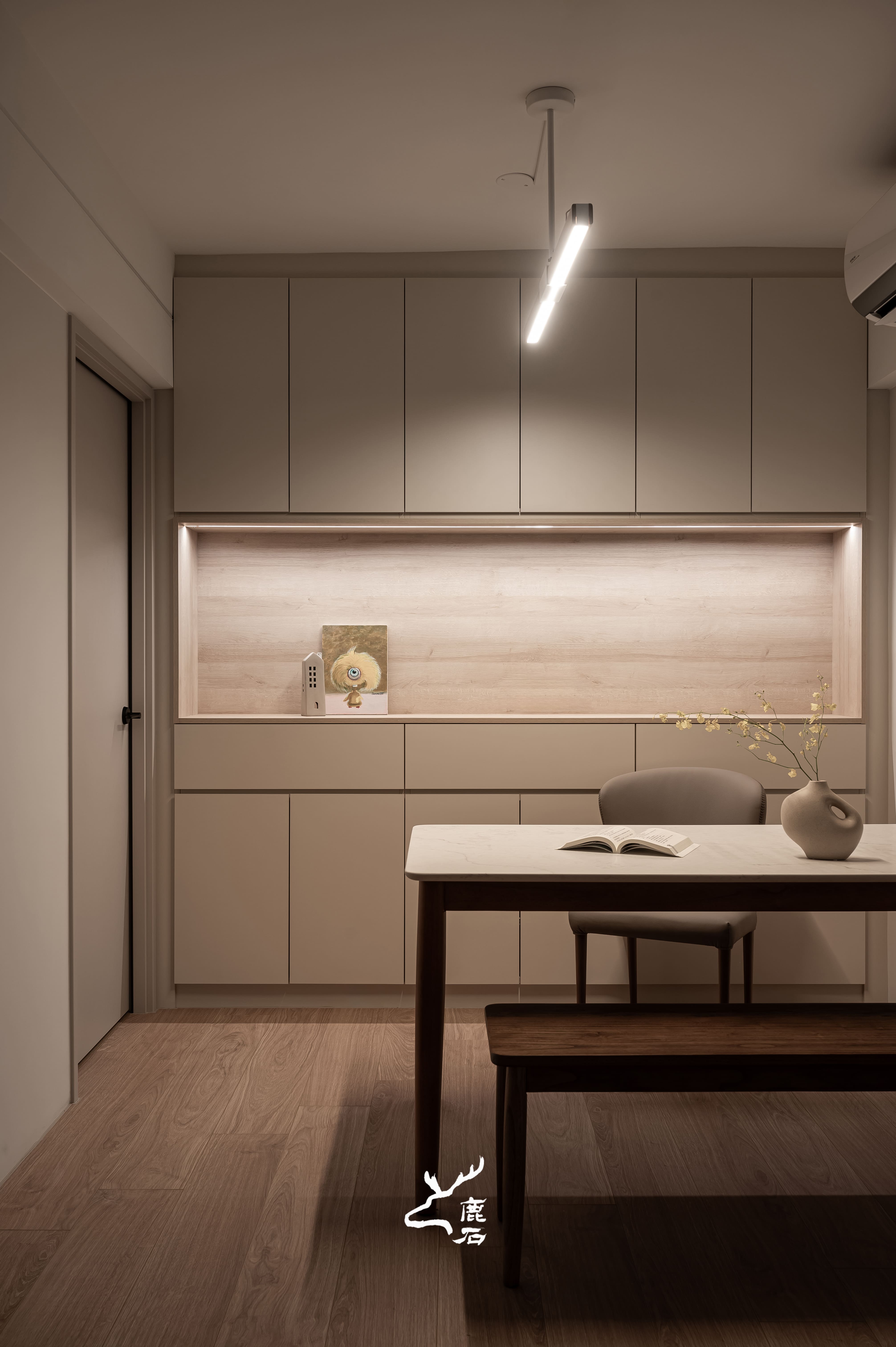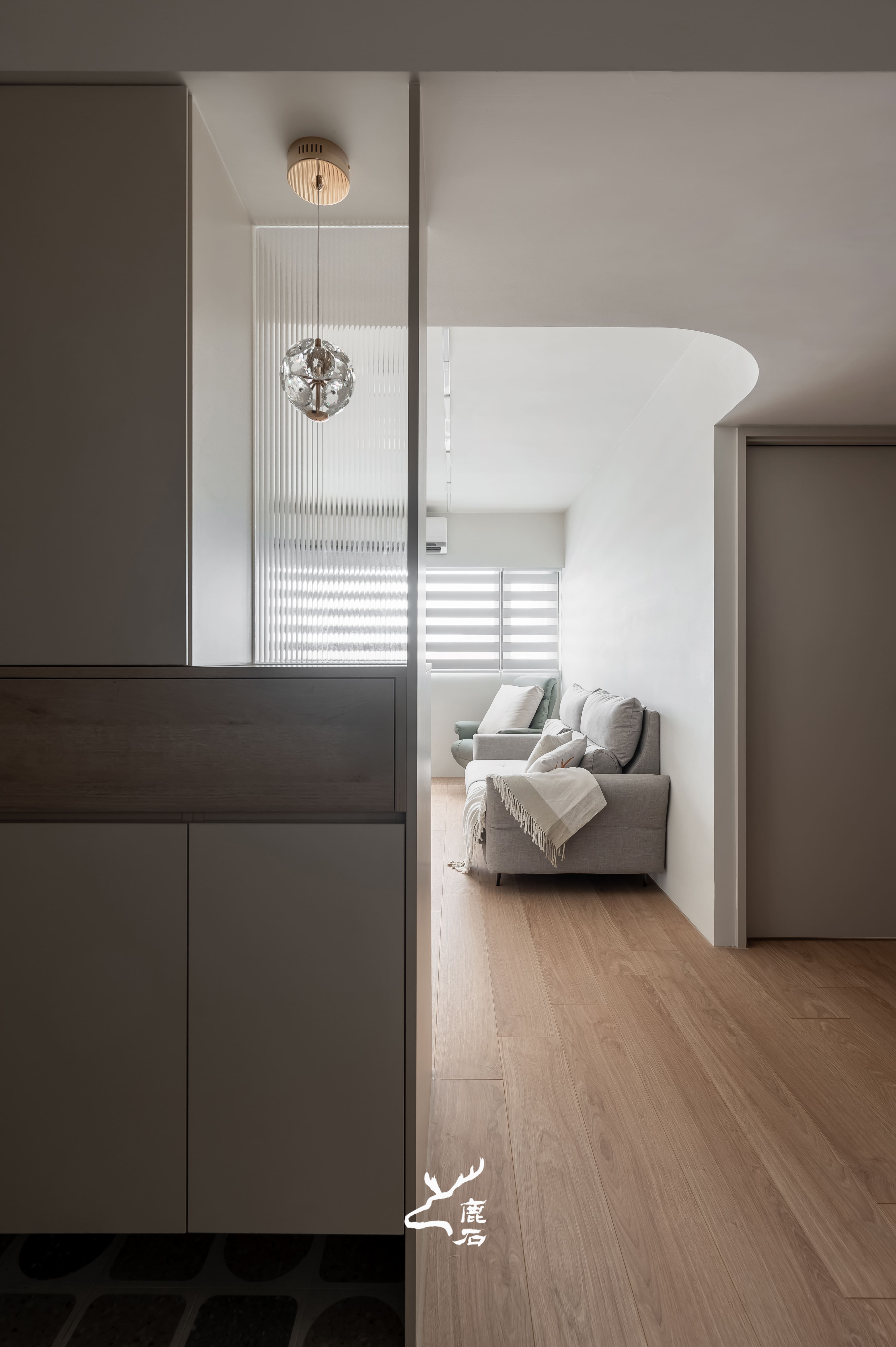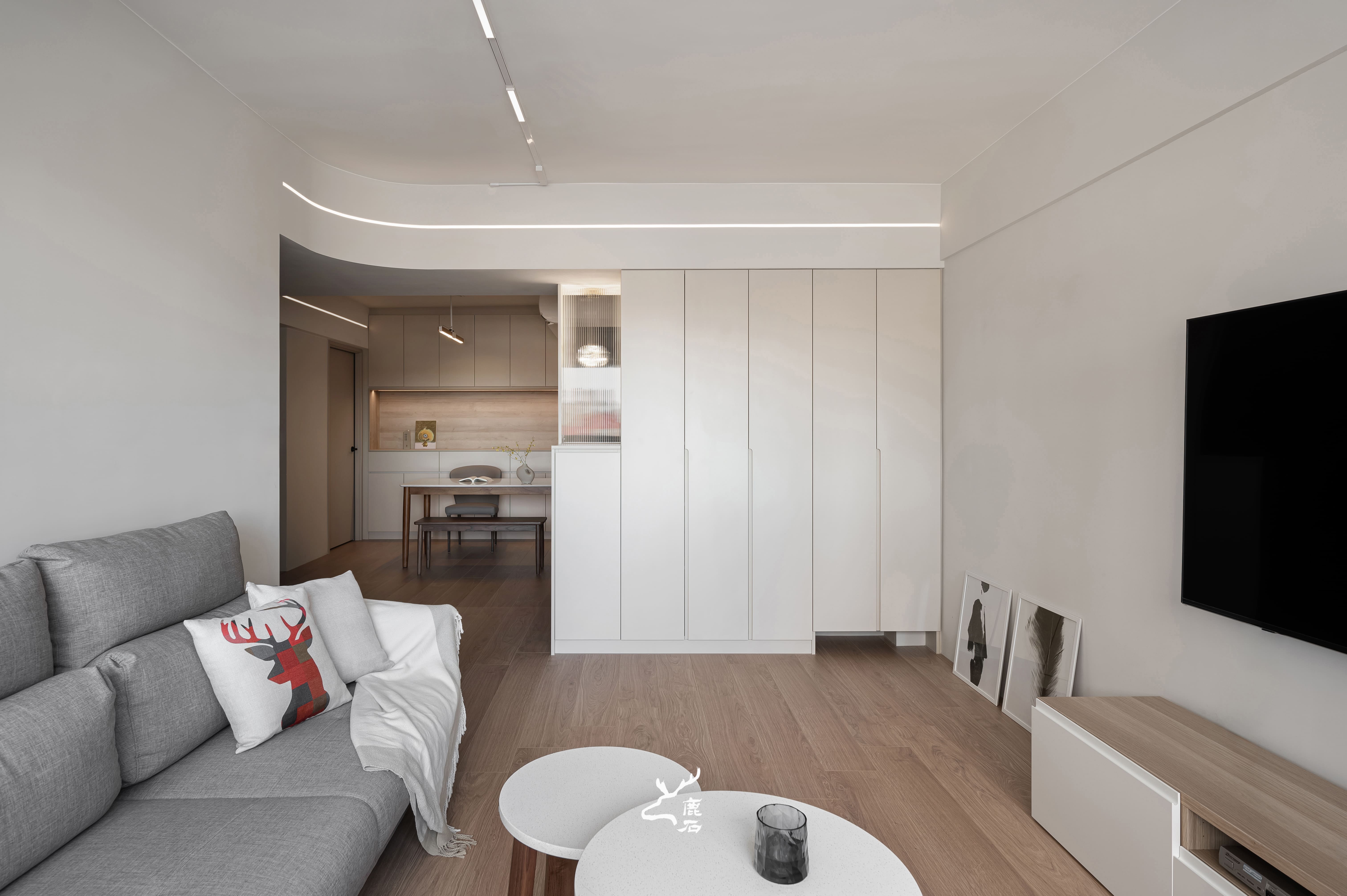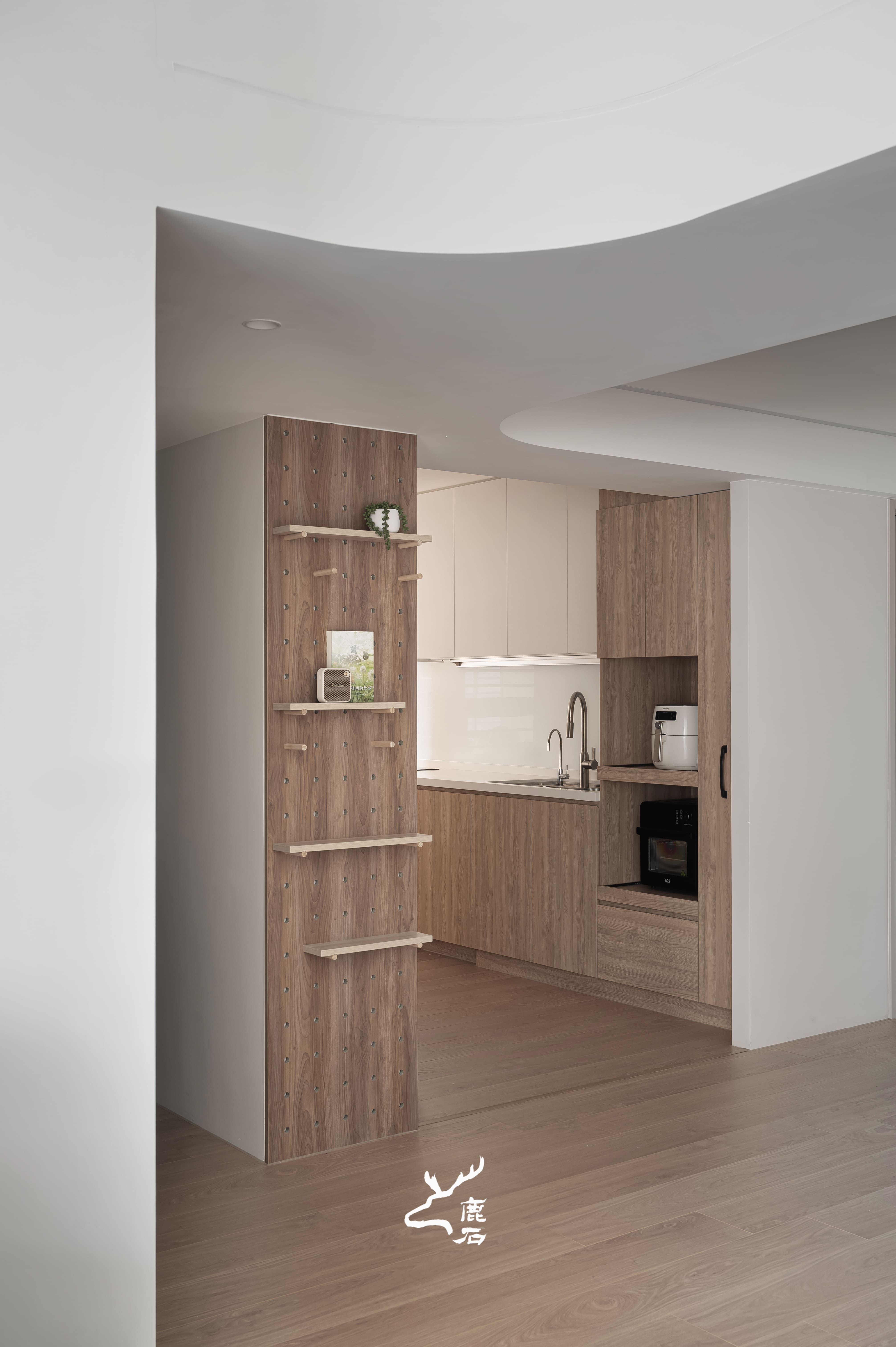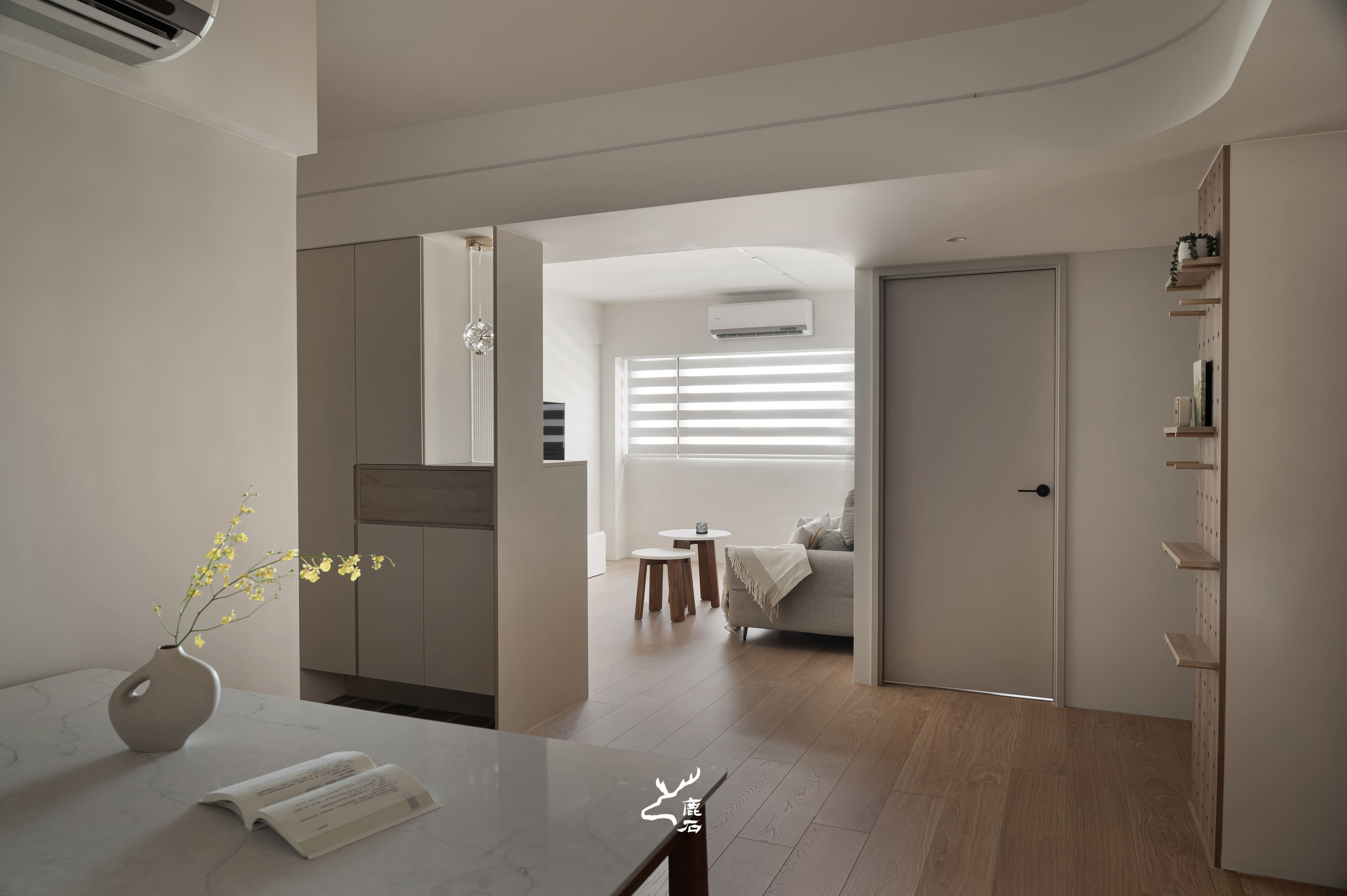 以柔弧天花與間接光鋪陳空間層次,光線沿著曲面緩緩流動,營造出安定而柔和的生活氛圍。整體以奶油白與溫潤木質為基調,透過細膩比例與適度留白,讓視覺回歸純粹,也讓身心自然放鬆。弧形轉折柔化場域界線,使動線與日常行為更為順暢,家的尺度因此顯得親切而包容。在光的陪伴下,空間不僅承載生活機能,也靜靜回應一家人細膩而溫暖的日常節奏。